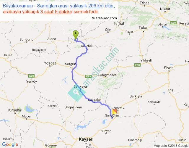 Büyüktoraman - Sarıoğlan arası yaklaşık olarak 90 km/h ile yukarıda belirtilen sürede olup, iki yerin kuş uçuşu uzaklığı (mesafesi) 135'dir. Yolculuk otobüsle 4 saat 5 dakika sürmektedir.