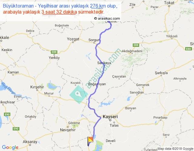 Büyüktoraman - Yeşilhisar arası yaklaşık olarak 90 km/h ile yukarıda belirtilen sürede olup, iki yerin kuş uçuşu uzaklığı (mesafesi) 202'dir. Yolculuk otobüsle 4 saat 35 dakika sürmektedir.