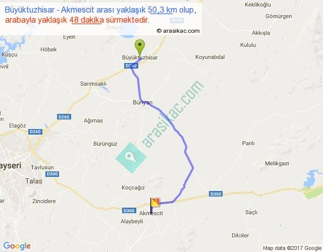 Büyüktuzhisar - Akmescit arası yaklaşık olarak 90 km/h ile yukarıda belirtilen sürede olup, iki yerin kuş uçuşu uzaklığı (mesafesi) 37'dir. Yolculuk otobüsle 1 saat 2 dakika sürmektedir.