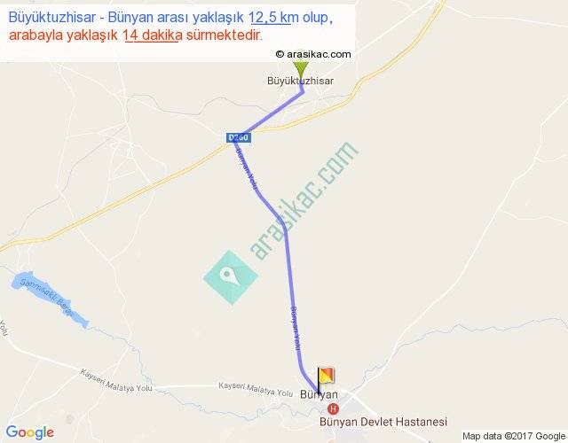 Büyüktuzhisar - Bünyan arası yaklaşık olarak 90 km/h ile yukarıda belirtilen sürede olup, iki yerin kuş uçuşu uzaklığı (mesafesi) 10'dir. Yolculuk otobüsle 18 dakika sürmektedir.