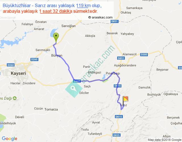 Büyüktuzhisar - Sarız arası yaklaşık olarak 90 km/h ile yukarıda belirtilen sürede olup, iki yerin kuş uçuşu uzaklığı (mesafesi) 77'dir. Yolculuk otobüsle 1 saat 59 dakika sürmektedir.
