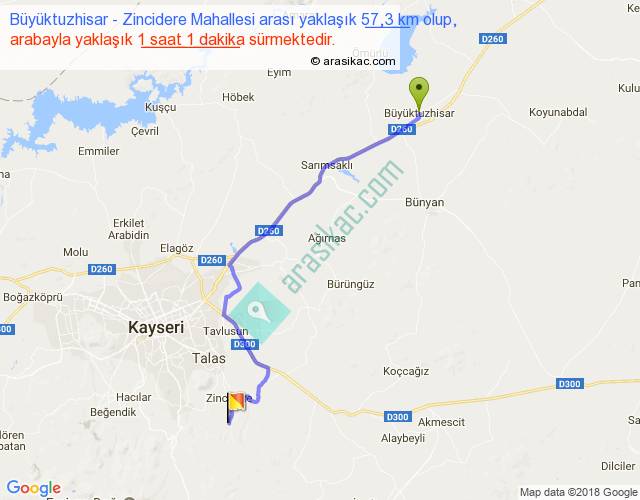 Büyüktuzhisar - Zincidere Mahallesi arası yaklaşık olarak 90 km/h ile yukarıda belirtilen sürede olup, iki yerin kuş uçuşu uzaklığı (mesafesi) 43'dir. Yolculuk otobüsle 1 saat 19 dakika sürmektedir.