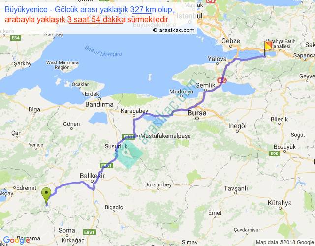 Büyükyenice - Gölcük arası yaklaşık olarak 90 km/h ile yukarıda belirtilen sürede olup, iki yerin kuş uçuşu uzaklığı (mesafesi) 250'dir. Yolculuk otobüsle 5 saat 4 dakika sürmektedir.