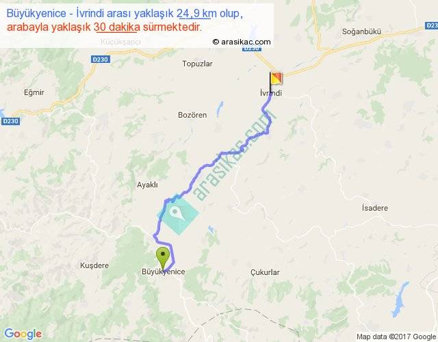 Büyükyenice - İvrindi arası yaklaşık olarak 90 km/h ile yukarıda belirtilen sürede olup, iki yerin kuş uçuşu uzaklığı (mesafesi) 18'dir. Yolculuk otobüsle 39 dakika sürmektedir.