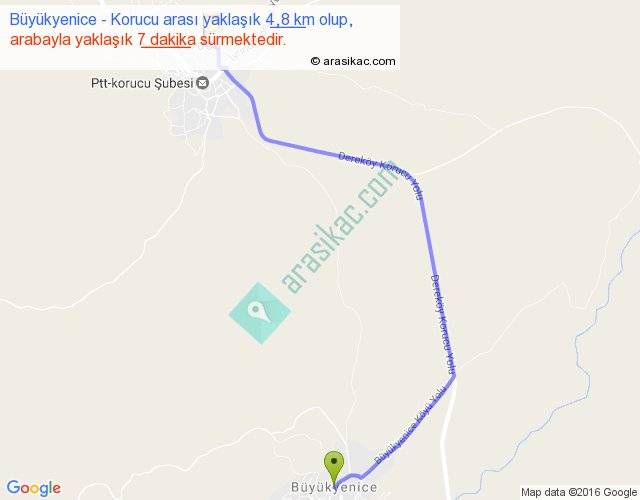 Büyükyenice - Korucu arası yaklaşık olarak 90 km/h ile yukarıda belirtilen sürede olup, iki yerin kuş uçuşu uzaklığı (mesafesi) 3'dir. Yolculuk otobüsle 9 dakika sürmektedir.