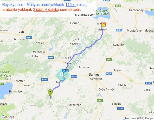 Büyükyenice - Manyas arası yaklaşık olarak 90 km/h ile yukarıda belirtilen sürede olup, iki yerin kuş uçuşu uzaklığı (mesafesi) 84'dir. Yolculuk otobüsle 2 saat 41 dakika sürmektedir.
