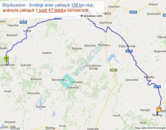 Büyükyenice - Sındırgı arası yaklaşık olarak 90 km/h ile yukarıda belirtilen sürede olup, iki yerin kuş uçuşu uzaklığı (mesafesi) 72'dir. Yolculuk otobüsle 2 saat 19 dakika sürmektedir.
