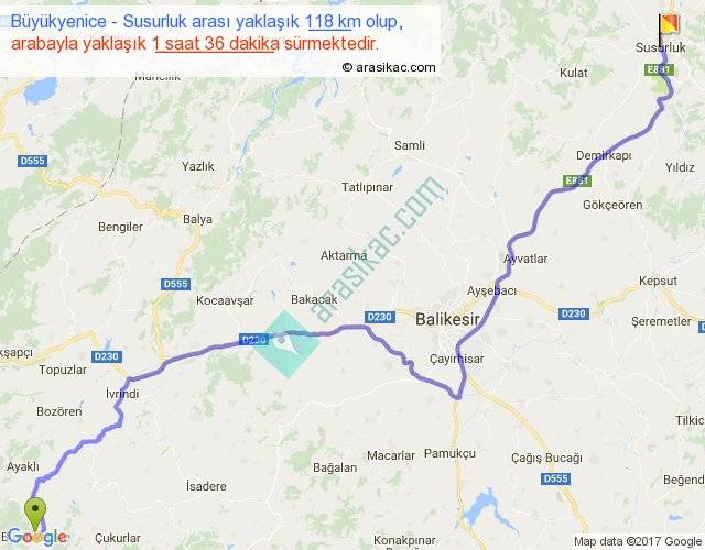 Büyükyenice - Susurluk arası yaklaşık olarak 90 km/h ile yukarıda belirtilen sürede olup, iki yerin kuş uçuşu uzaklığı (mesafesi) 84'dir. Yolculuk otobüsle 2 saat 4 dakika sürmektedir.