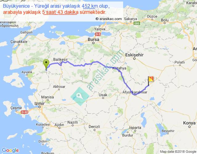 Büyükyenice - Yüreğil arası yaklaşık olarak 90 km/h ile yukarıda belirtilen sürede olup, iki yerin kuş uçuşu uzaklığı (mesafesi) 316'dir. Eğer belirtilen yerler arasında uçak seferi var ise bu süre uçakla 29 dakika'ya kadar düşebilir. Yolculuk otobüsle 7 saat 25 dakika sürmektedir.