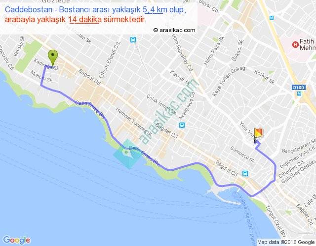 Caddebostan - Bostancı arası yaklaşık olarak 90 km/h ile yukarıda belirtilen sürede olup, iki yerin kuş uçuşu uzaklığı (mesafesi) 3'dir. Yolculuk otobüsle 18 dakika sürmektedir.