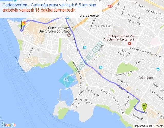Caddebostan - Caferağa arası yaklaşık olarak 90 km/h ile yukarıda belirtilen sürede olup, iki yerin kuş uçuşu uzaklığı (mesafesi) 4'dir. Yolculuk otobüsle 20 dakika sürmektedir.