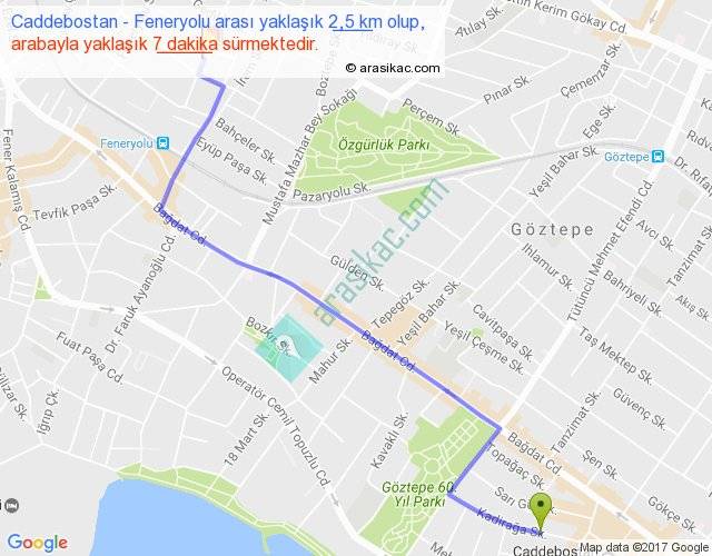 Caddebostan - Feneryolu arası yaklaşık olarak 90 km/h ile yukarıda belirtilen sürede olup, iki yerin kuş uçuşu uzaklığı (mesafesi) 2'dir. Yolculuk otobüsle 9 dakika sürmektedir.