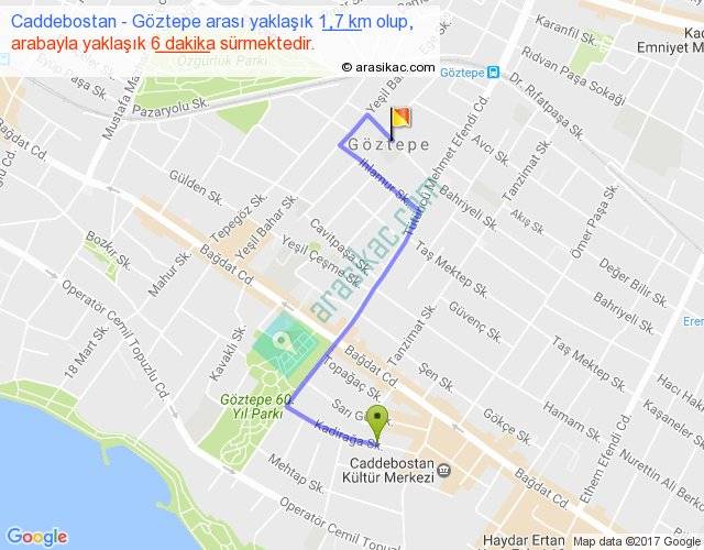 Caddebostan - Göztepe arası yaklaşık olarak 90 km/h ile yukarıda belirtilen sürede olup, iki yerin kuş uçuşu uzaklığı (mesafesi) 1'dir. Yolculuk otobüsle 7 dakika sürmektedir.
