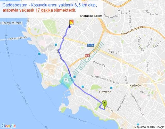 Caddebostan - Koşuyolu arası yaklaşık olarak 90 km/h ile yukarıda belirtilen sürede olup, iki yerin kuş uçuşu uzaklığı (mesafesi) 5'dir. Yolculuk otobüsle 22 dakika sürmektedir.