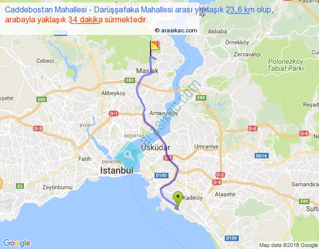 Caddebostan Mahallesi - Darüşşafaka Mahallesi arası yaklaşık olarak 90 km/h ile yukarıda belirtilen sürede olup, iki yerin kuş uçuşu uzaklığı (mesafesi) 18'dir. Yolculuk otobüsle 44 dakika sürmektedir.