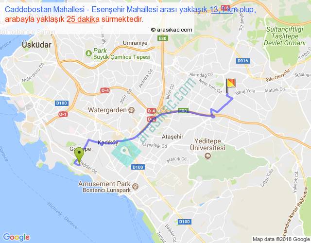 Caddebostan Mahallesi - Esenşehir Mahallesi arası yaklaşık olarak 90 km/h ile yukarıda belirtilen sürede olup, iki yerin kuş uçuşu uzaklığı (mesafesi) 10'dir. Yolculuk otobüsle 32 dakika sürmektedir.
