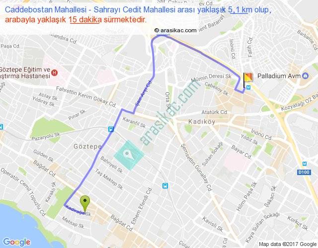 Caddebostan Mahallesi - Sahrayı Cedit Mahallesi arası yaklaşık olarak 90 km/h ile yukarıda belirtilen sürede olup, iki yerin kuş uçuşu uzaklığı (mesafesi) 3'dir. Yolculuk otobüsle 19 dakika sürmektedir.