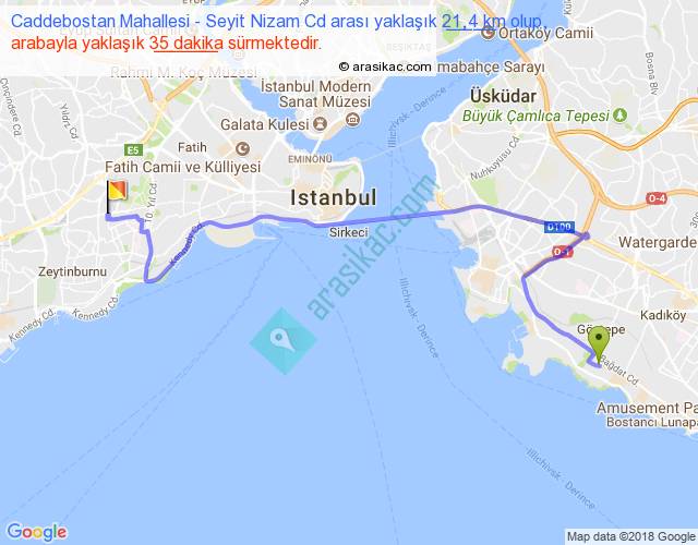 Caddebostan Mahallesi - Seyit Nizam Cd arası yaklaşık olarak 90 km/h ile yukarıda belirtilen sürede olup, iki yerin kuş uçuşu uzaklığı (mesafesi) 13'dir. Yolculuk otobüsle 45 dakika sürmektedir.