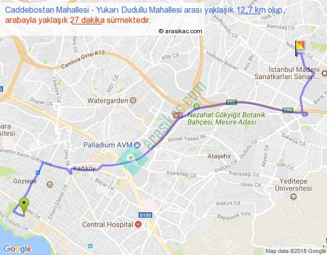 Caddebostan Mahallesi - Yukarı Dudullu Mahallesi arası yaklaşık olarak 90 km/h ile yukarıda belirtilen sürede olup, iki yerin kuş uçuşu uzaklığı (mesafesi) 9'dir. Yolculuk otobüsle 35 dakika sürmektedir.