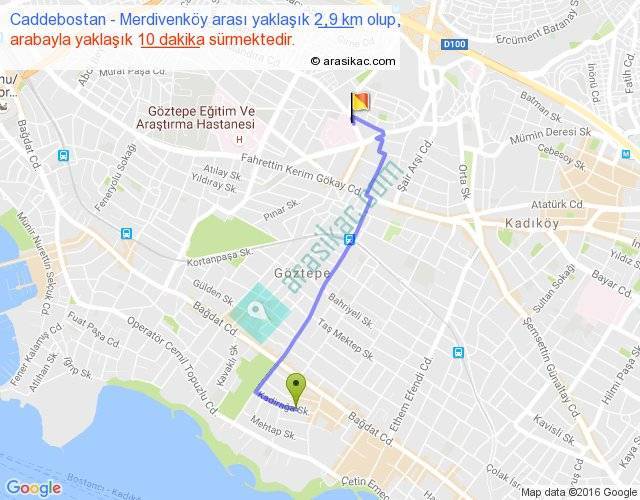 Caddebostan - Merdivenköy arası yaklaşık olarak 90 km/h ile yukarıda belirtilen sürede olup, iki yerin kuş uçuşu uzaklığı (mesafesi) 2'dir. Yolculuk otobüsle 13 dakika sürmektedir.