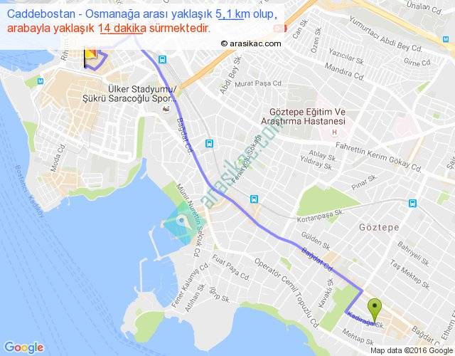 Caddebostan - Osmanağa arası yaklaşık olarak 90 km/h ile yukarıda belirtilen sürede olup, iki yerin kuş uçuşu uzaklığı (mesafesi) 4'dir. Yolculuk otobüsle 18 dakika sürmektedir.