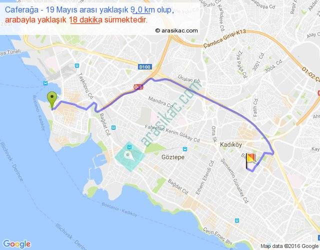 Caferağa - 19 Mayıs arası yaklaşık olarak 90 km/h ile yukarıda belirtilen sürede olup, iki yerin kuş uçuşu uzaklığı (mesafesi) 6'dir. Yolculuk otobüsle 23 dakika sürmektedir.