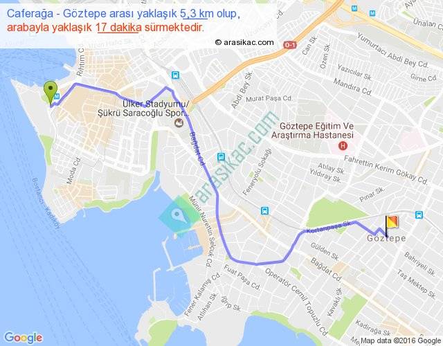 Caferağa - Göztepe arası yaklaşık olarak 90 km/h ile yukarıda belirtilen sürede olup, iki yerin kuş uçuşu uzaklığı (mesafesi) 4'dir. Yolculuk otobüsle 22 dakika sürmektedir.