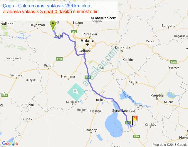 Çağa - Çalören arası yaklaşık olarak 90 km/h ile yukarıda belirtilen sürede olup, iki yerin kuş uçuşu uzaklığı (mesafesi) 197'dir. Yolculuk otobüsle 3 saat 54 dakika sürmektedir.