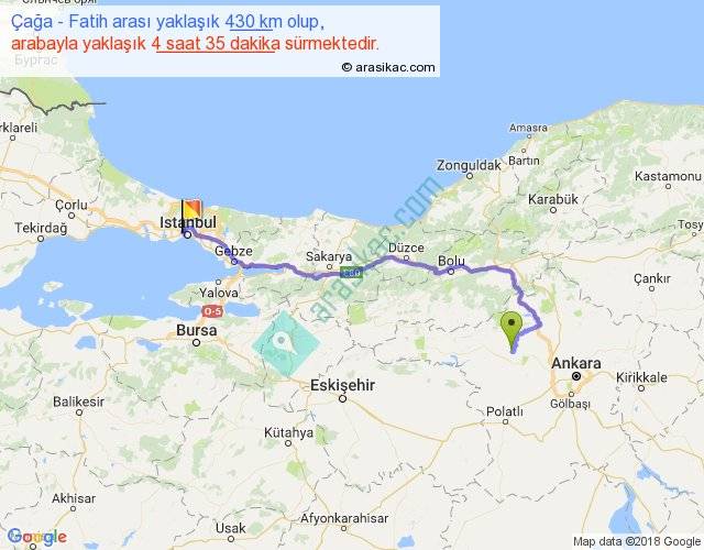 Çağa - Fatih arası yaklaşık olarak 90 km/h ile yukarıda belirtilen sürede olup, iki yerin kuş uçuşu uzaklığı (mesafesi) 293'dir. Eğer belirtilen yerler arasında uçak seferi var ise bu süre uçakla 27 dakika'ya kadar düşebilir. Yolculuk otobüsle 5 saat 57 dakika sürmektedir.