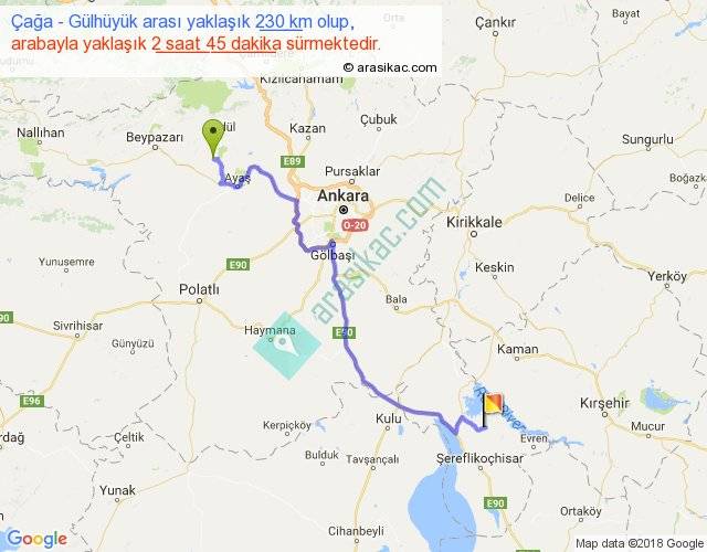 Çağa - Gülhüyük arası yaklaşık olarak 90 km/h ile yukarıda belirtilen sürede olup, iki yerin kuş uçuşu uzaklığı (mesafesi) 162'dir. Yolculuk otobüsle 3 saat 34 dakika sürmektedir.