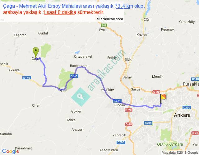 Çağa - Mehmet Akif Ersoy Mahallesi arası yaklaşık olarak 90 km/h ile yukarıda belirtilen sürede olup, iki yerin kuş uçuşu uzaklığı (mesafesi) 50'dir. Yolculuk otobüsle 1 saat 28 dakika sürmektedir.