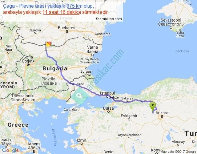 Çağa - Plevne arası yaklaşık olarak 90 km/h ile yukarıda belirtilen sürede olup, iki yerin kuş uçuşu uzaklığı (mesafesi) 725'dir. Eğer belirtilen yerler arasında uçak seferi var ise bu süre uçakla 1 saat 06 dakika'ya kadar düşebilir. Yolculuk otobüsle 14 saat 38 dakika sürmektedir.