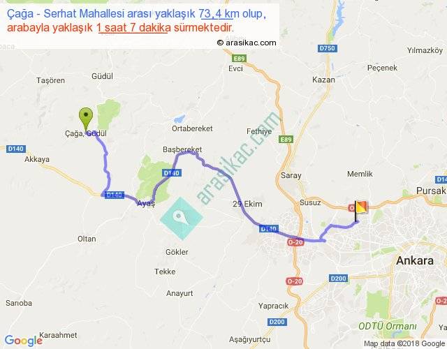 Çağa - Serhat Mahallesi arası yaklaşık olarak 90 km/h ile yukarıda belirtilen sürede olup, iki yerin kuş uçuşu uzaklığı (mesafesi) 47'dir. Yolculuk otobüsle 1 saat 27 dakika sürmektedir.