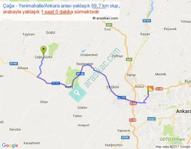 Çağa - Yenimahalle Ankara arası yaklaşık olarak 90 km/h ile yukarıda belirtilen sürede olup, iki yerin kuş uçuşu uzaklığı (mesafesi) 43'dir. Yolculuk otobüsle 1 saat 18 dakika sürmektedir.