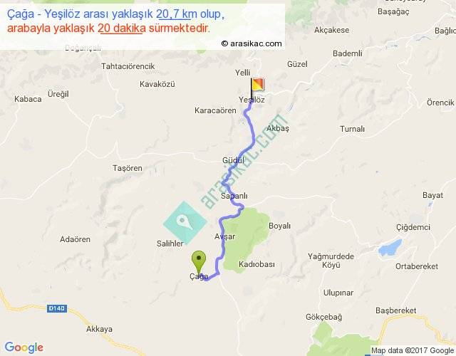 Çağa - Yeşilöz arası yaklaşık olarak 90 km/h ile yukarıda belirtilen sürede olup, iki yerin kuş uçuşu uzaklığı (mesafesi) 15'dir. Yolculuk otobüsle 26 dakika sürmektedir.