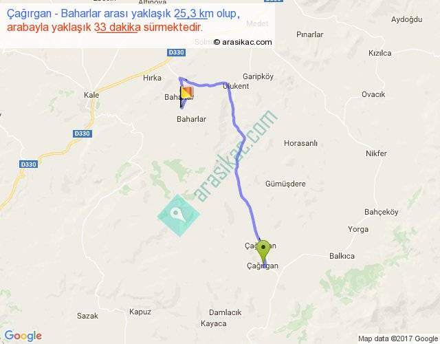 Çağırgan - Baharlar arası yaklaşık olarak 90 km/h ile yukarıda belirtilen sürede olup, iki yerin kuş uçuşu uzaklığı (mesafesi) 16'dir. Yolculuk otobüsle 42 dakika sürmektedir.
