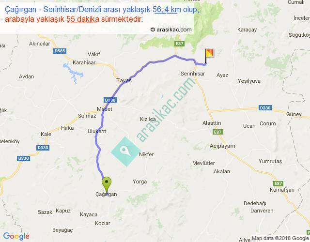 Çağırgan - Serinhisar Denizli arası yaklaşık olarak 90 km/h ile yukarıda belirtilen sürede olup, iki yerin kuş uçuşu uzaklığı (mesafesi) 41'dir. Yolculuk otobüsle 1 saat 11 dakika sürmektedir.