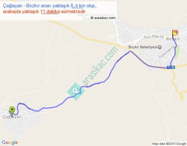 Çağlayan - Bozkır arası yaklaşık olarak 90 km/h ile yukarıda belirtilen sürede olup, iki yerin kuş uçuşu uzaklığı (mesafesi) 5'dir. Yolculuk otobüsle 14 dakika sürmektedir.