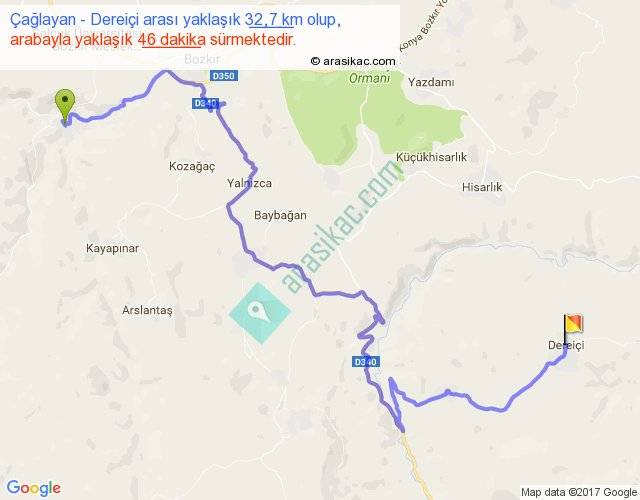 Çağlayan - Dereiçi arası yaklaşık olarak 90 km/h ile yukarıda belirtilen sürede olup, iki yerin kuş uçuşu uzaklığı (mesafesi) 17'dir. Yolculuk otobüsle 59 dakika sürmektedir.