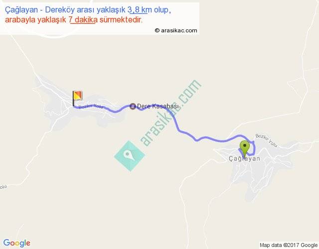 Çağlayan - Dereköy arası yaklaşık olarak 90 km/h ile yukarıda belirtilen sürede olup, iki yerin kuş uçuşu uzaklığı (mesafesi) 3'dir. Yolculuk otobüsle 9 dakika sürmektedir.