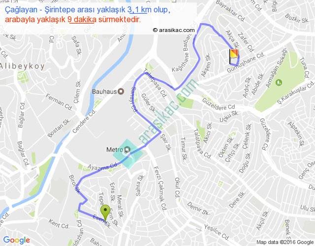 Çağlayan - Şirintepe arası yaklaşık olarak 90 km/h ile yukarıda belirtilen sürede olup, iki yerin kuş uçuşu uzaklığı (mesafesi) 1'dir. Yolculuk otobüsle 11 dakika sürmektedir.