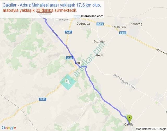Çakıllar - Adsız Mahallesi arası yaklaşık olarak 90 km/h ile yukarıda belirtilen sürede olup, iki yerin kuş uçuşu uzaklığı (mesafesi) 16'dir. Yolculuk otobüsle 29 dakika sürmektedir.