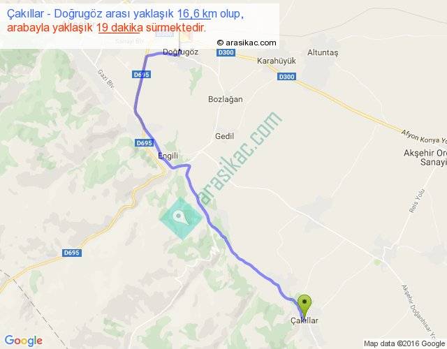 Çakıllar - Doğrugöz arası yaklaşık olarak 90 km/h ile yukarıda belirtilen sürede olup, iki yerin kuş uçuşu uzaklığı (mesafesi) 13'dir. Yolculuk otobüsle 24 dakika sürmektedir.