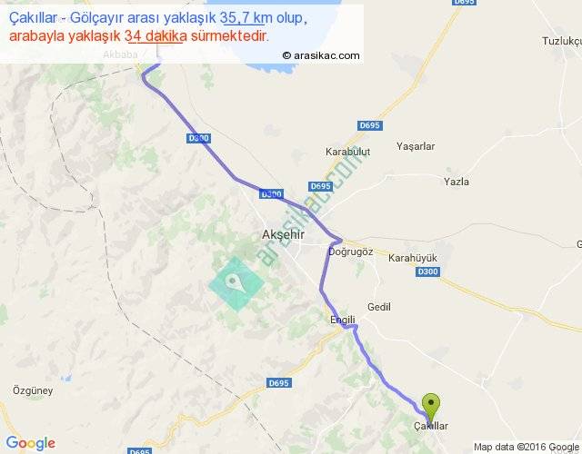 Çakıllar - Gölçayır arası yaklaşık olarak 90 km/h ile yukarıda belirtilen sürede olup, iki yerin kuş uçuşu uzaklığı (mesafesi) 30'dir. Yolculuk otobüsle 44 dakika sürmektedir.