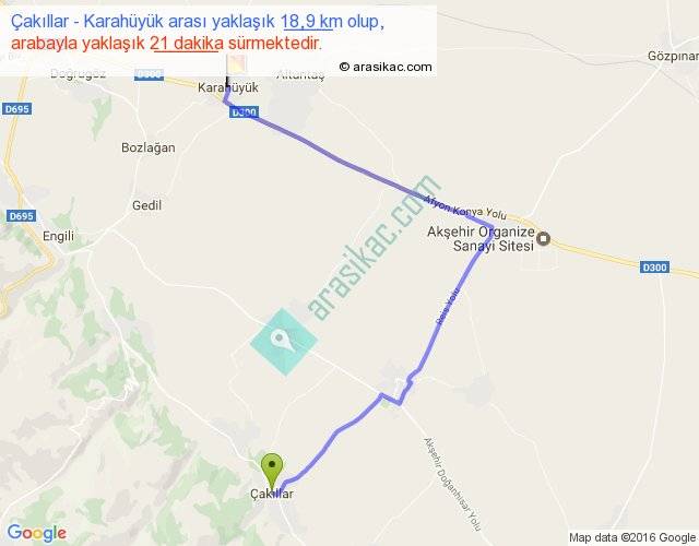 Çakıllar - Karahüyük arası yaklaşık olarak 90 km/h ile yukarıda belirtilen sürede olup, iki yerin kuş uçuşu uzaklığı (mesafesi) 11'dir. Yolculuk otobüsle 27 dakika sürmektedir.