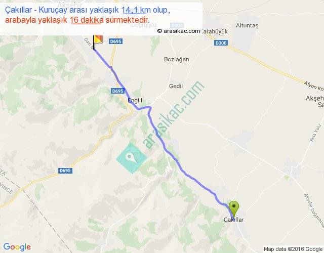 Çakıllar - Kuruçay arası yaklaşık olarak 90 km/h ile yukarıda belirtilen sürede olup, iki yerin kuş uçuşu uzaklığı (mesafesi) 13'dir. Yolculuk otobüsle 20 dakika sürmektedir.