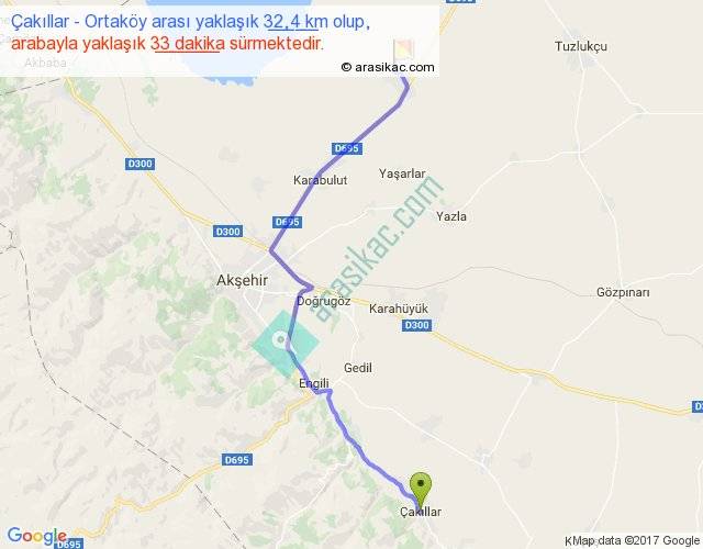 Çakıllar - Ortaköy arası yaklaşık olarak 90 km/h ile yukarıda belirtilen sürede olup, iki yerin kuş uçuşu uzaklığı (mesafesi) 24'dir. Yolculuk otobüsle 42 dakika sürmektedir.