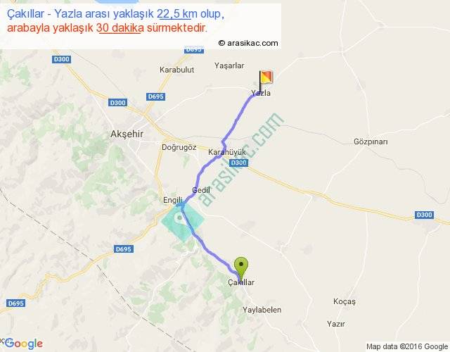 Çakıllar - Yazla arası yaklaşık olarak 90 km/h ile yukarıda belirtilen sürede olup, iki yerin kuş uçuşu uzaklığı (mesafesi) 16'dir. Yolculuk otobüsle 39 dakika sürmektedir.