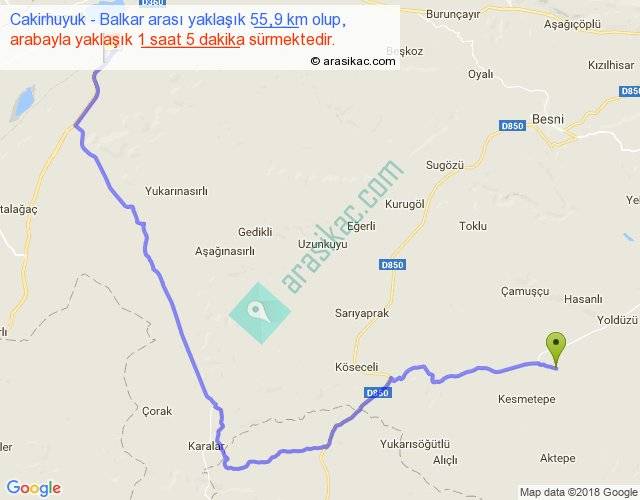 Cakirhuyuk - Balkar arası yaklaşık olarak 90 km/h ile yukarıda belirtilen sürede olup, iki yerin kuş uçuşu uzaklığı (mesafesi) 33'dir. Yolculuk otobüsle 1 saat 24 dakika sürmektedir.