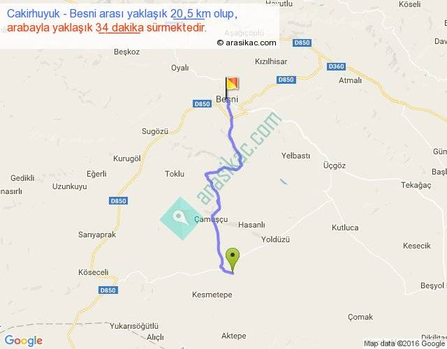Cakirhuyuk - Besni arası yaklaşık olarak 90 km/h ile yukarıda belirtilen sürede olup, iki yerin kuş uçuşu uzaklığı (mesafesi) 15'dir. Yolculuk otobüsle 44 dakika sürmektedir.